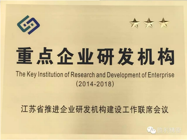 胜利精密荣获江苏省推进企业研发机构建设工作联席会授予的“重点企业研发机构”称号