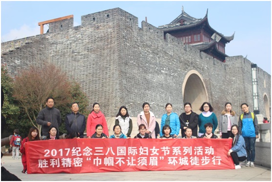 为庆祝国际妇女节,3月11日,胜利精密工会组织的“巾帼不让须眉”环城徒步行活动,在环城步道相门城楼处举行。胜利精密的工会委员,各工作片女职工代表,在工会主席殳启群的带领下,从相门出发,途径娄门、齐门、平门,向目的地阊门古城墙前进。