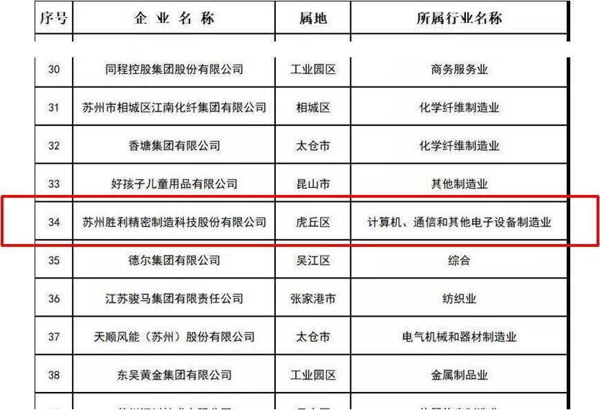 2021年8月27日, 苏州市工商业联合会、苏州市总商会发布“2021年苏州民营企业100强”名单,胜利精密名列榜单第34位。