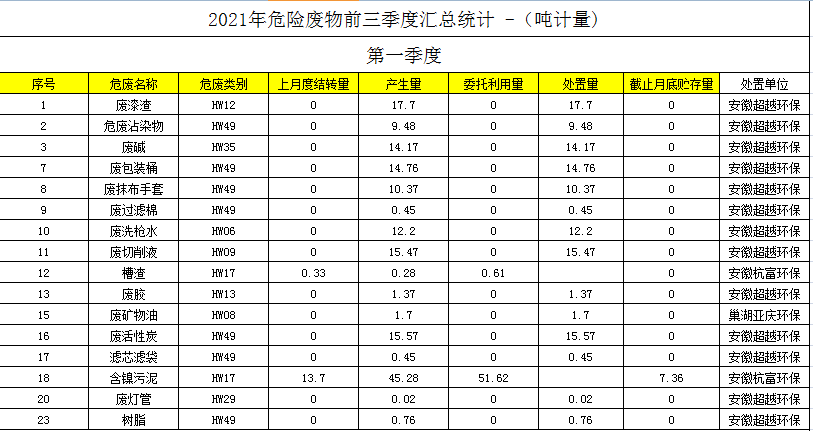 主题:2021年度第一季度安徽胜利精密制造科技有限公司危险废物产生及处置情况