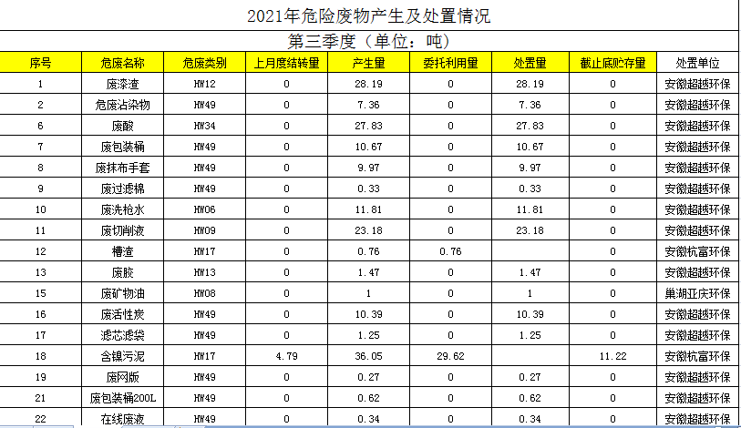正文:根据环境相关法律法规要求现将安徽胜利精密制造科技有限公司2021年度第三季度安徽胜利精密制造科技有限公司危险废物产生及处置情况相关信息予以公开,详细见附件。